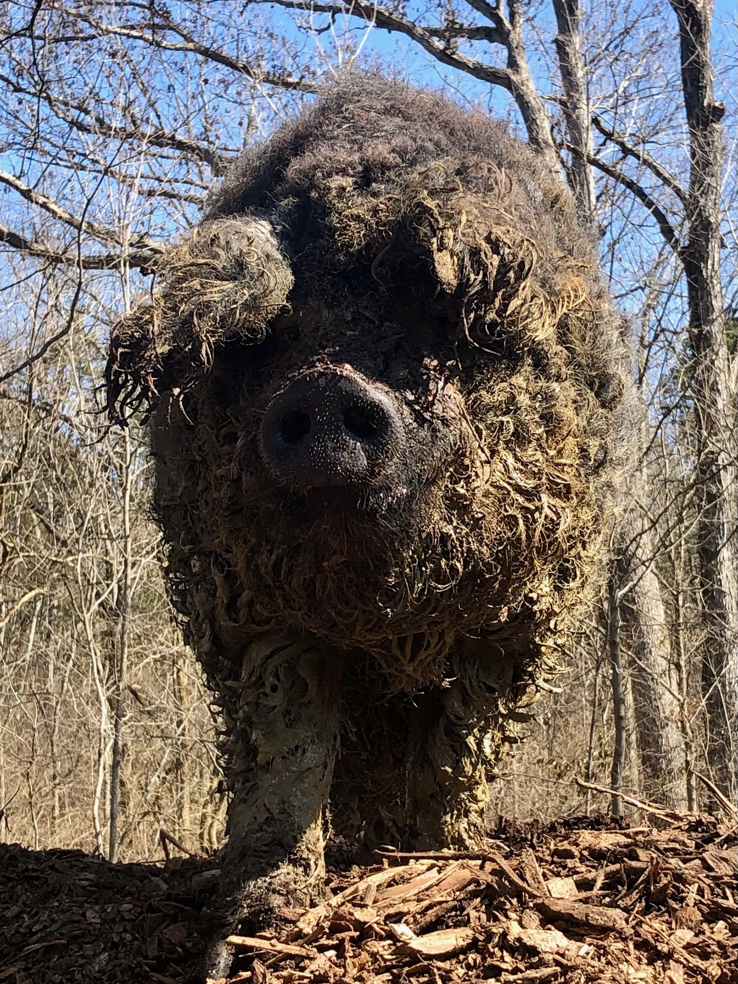 Champ is Big Tuffy Farms’ Mangalitsa Swallow Belly boar. An old soul at heart, Champ can be found napping under the comfort of large, mature oak trees. Champ is a very nice pig. He will quietly approach you wanting his head scratched. He is separated from the herd and has a nice area to live. He gets to interact with the other pigs throughout the day, as they make their way about the farm.